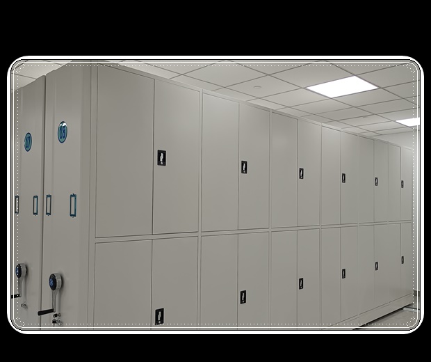 1、構(gòu)造:移動(dòng)密集柜、固定柜為框柜鋼結(jié)構(gòu)。主要由20mm×20mm方鋼軌道、3.0mm底盤、1.5mm復(fù)柱立桿、1.0mm擱板、1.2mm側(cè)面板、1.0mm門板、旋動(dòng)機(jī)構(gòu)、防震裝置、防倒裝置、制動(dòng)裝置以及防塵、防鼠裝置等部分組成。